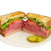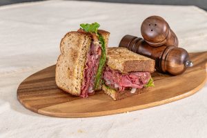 Hot pastrami and corned beef, lettuce. tomato, onion, stone ground mustard, and mayo on rye bread, toasted.