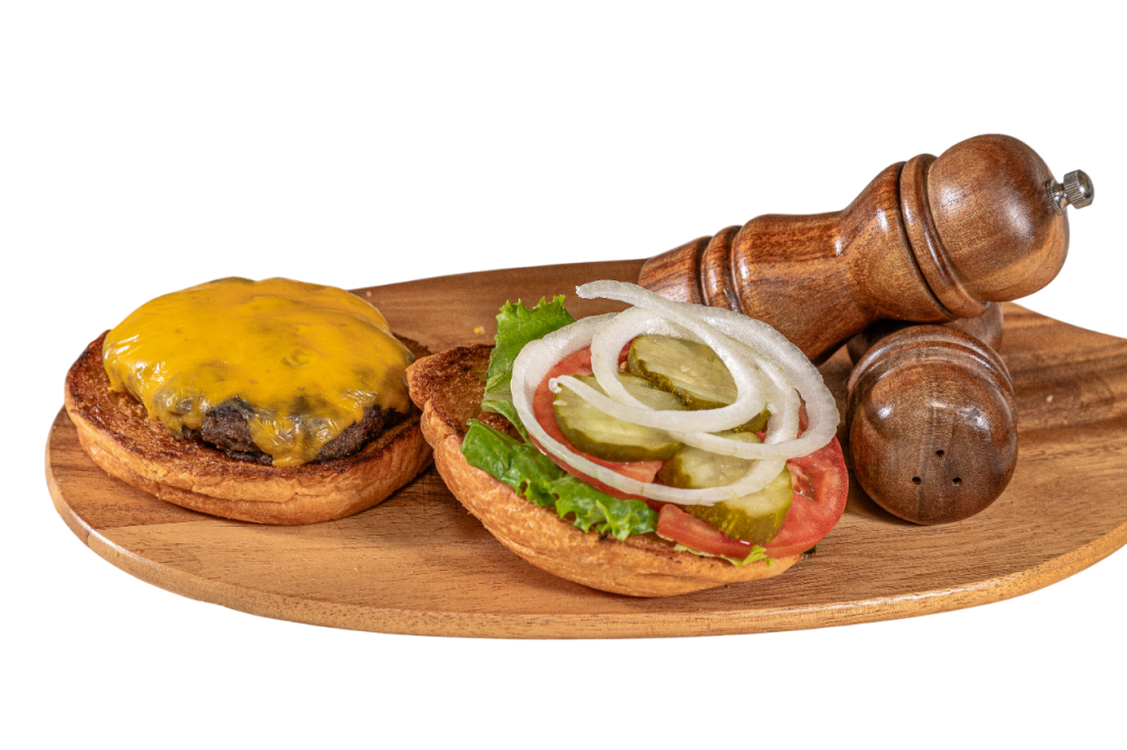 Half-pound fresh ground beef patty with your choice of toppings. Served with lettuce, tomato, onion, and pickles on a toasted bun.