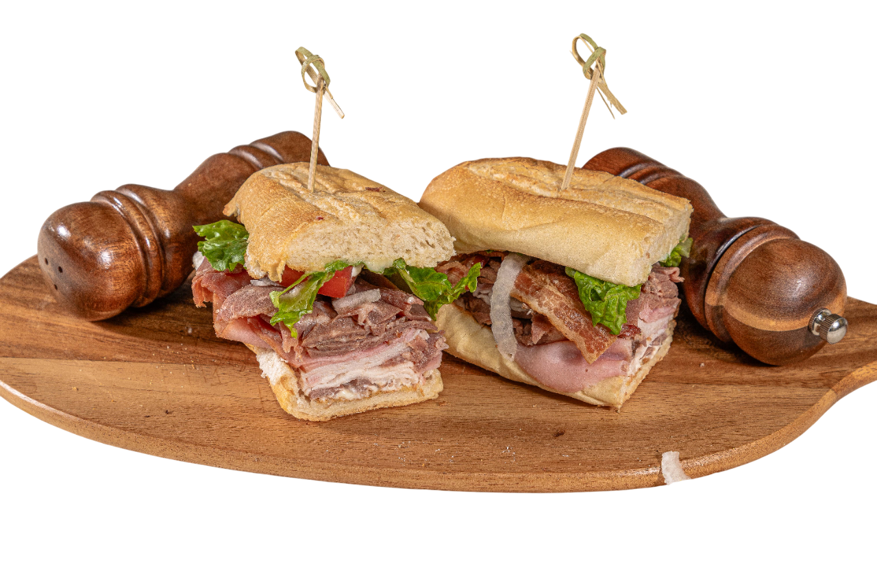 Roast beef, turkey, Bavarian ham, and bacon (totaling 1/2 pounds of meat) with lettuce, tomato, onion, and mayonnaise on a slightly toasted sub roll.