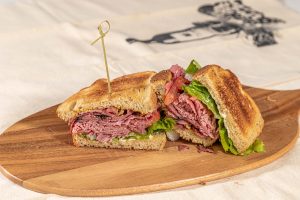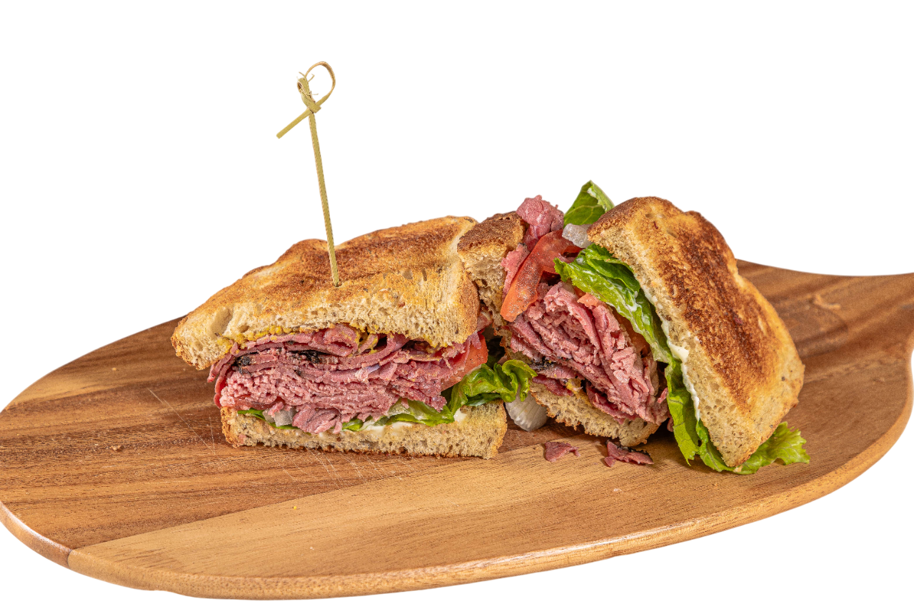 Hot pastrami and corned beef, lettuce. tomato, onion, stone ground mustard, and mayo on rye bread, toasted.
