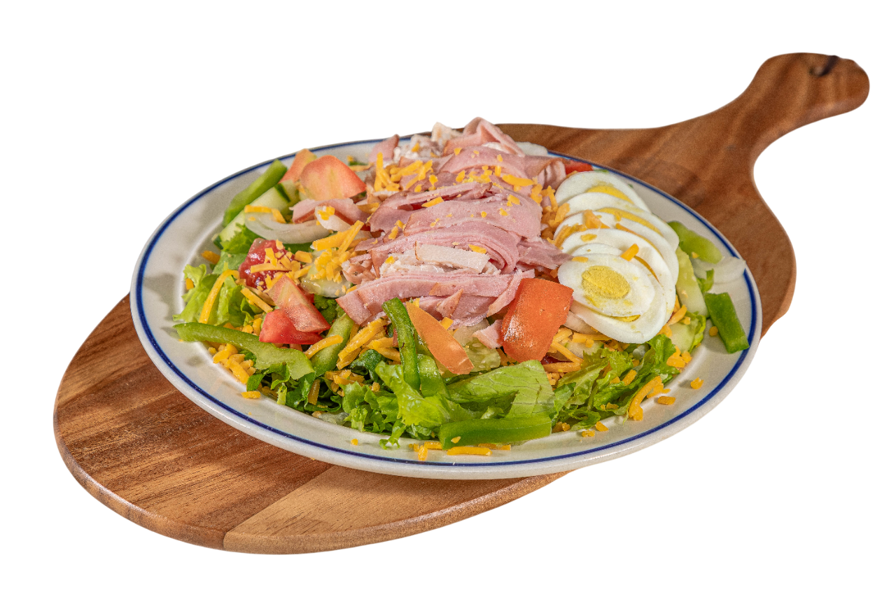 Ham, turkey, Cheddar cheese on a bed of leaf lettuce with tomato, onion, cucumber, green pepper, and boiled egg, with dressing on the side.