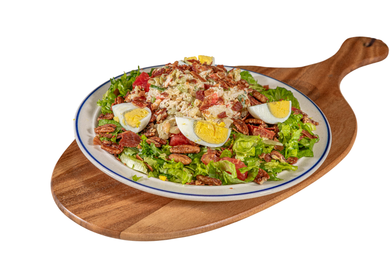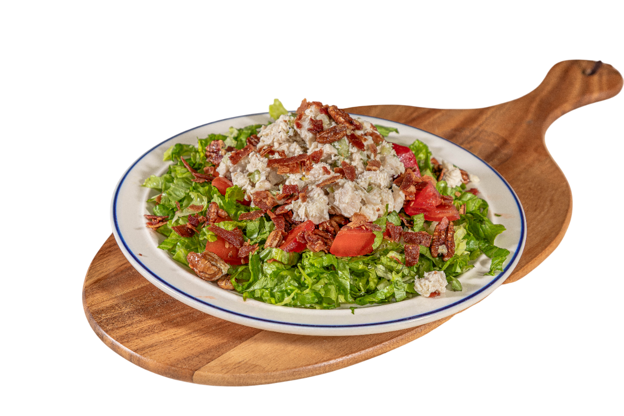 On a bed of lettuce with a generous scoop of our homemade chicken or tuna salad made with celery and served with bacon, tomato, and pecans.