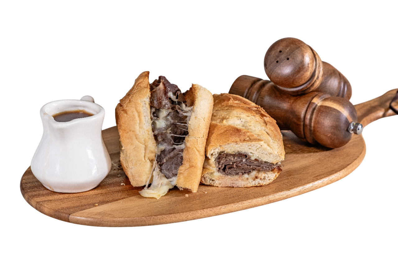 Dip into tradition with juicy roast beef covered with melted Provolone cheese and au jus on the side, on a lightly toasted sub roll. "One of Santee's favorites."