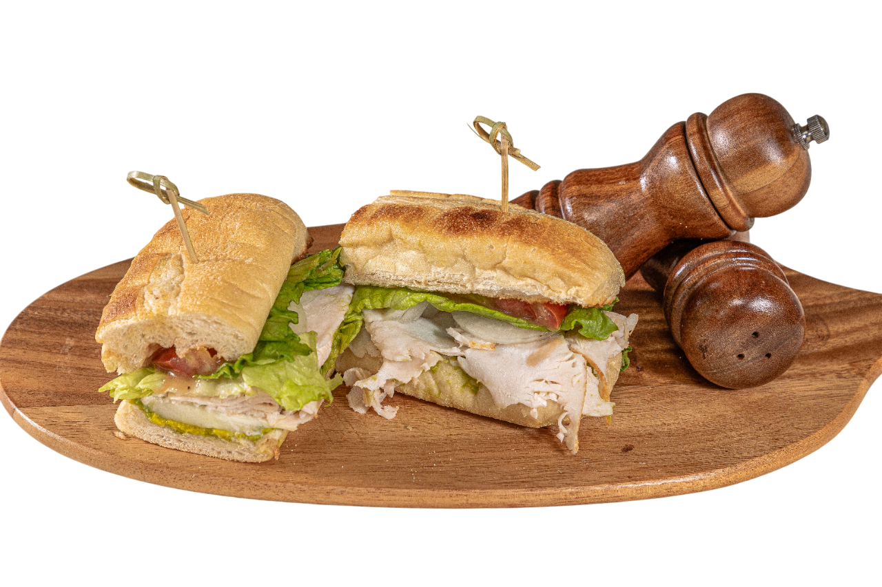 Turkeu, avacado spread, provolone cheese, lettuce, tomato, cucumber, onion, and balsamic vinaigrette dressing on a lightly toasted sub roll.